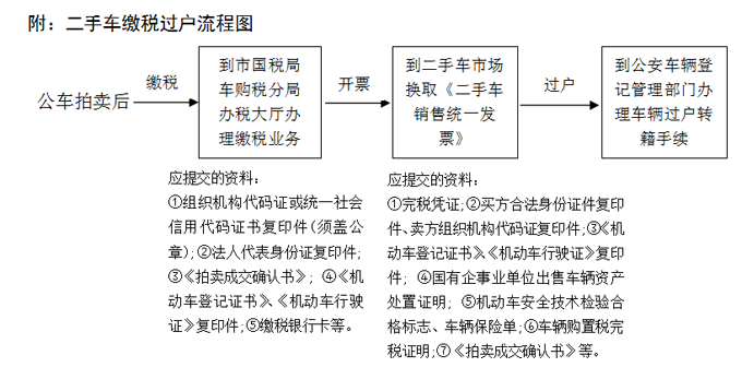 三、批量拍卖二手车辆的,为方便办理缴税业务,可由车辆处置单位统一出具《车辆处置明细表》,详细列明车辆型号、处置时间、成交金额等相关信息,到白山市国税局车购税管理分局办理缴税业务。