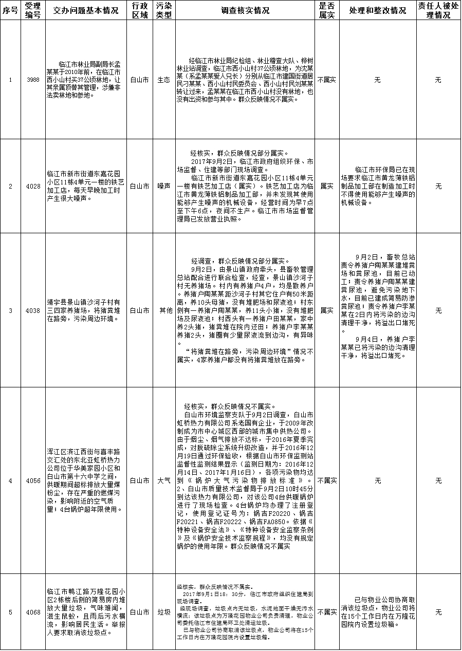 白山市群众信访举报转办和边督边改公开情况一览表(第21批 2017年9月10日)
