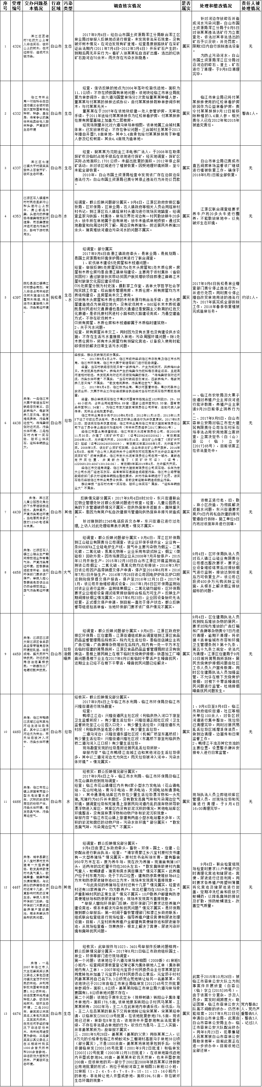 白山市群众信访举报转办和边督边改公开情况一览表(第24批 2017年9月13日)