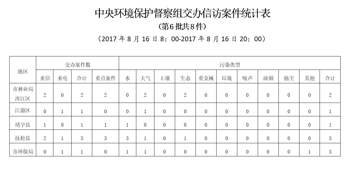 8月17日,中央第一环境保护督察组向白山市交办了第6批举报受理信访事项8件(重点案件6件),共涉及12个环境问题,其中涉气3个、涉水5个、生态3个、其他1个。共涉及4个县(市、区)和2个市直部门,其中市林业牵头,浑江区配合共同查处2件、江源区1件、靖宇县1件、抚松县3件、市环保局1件。