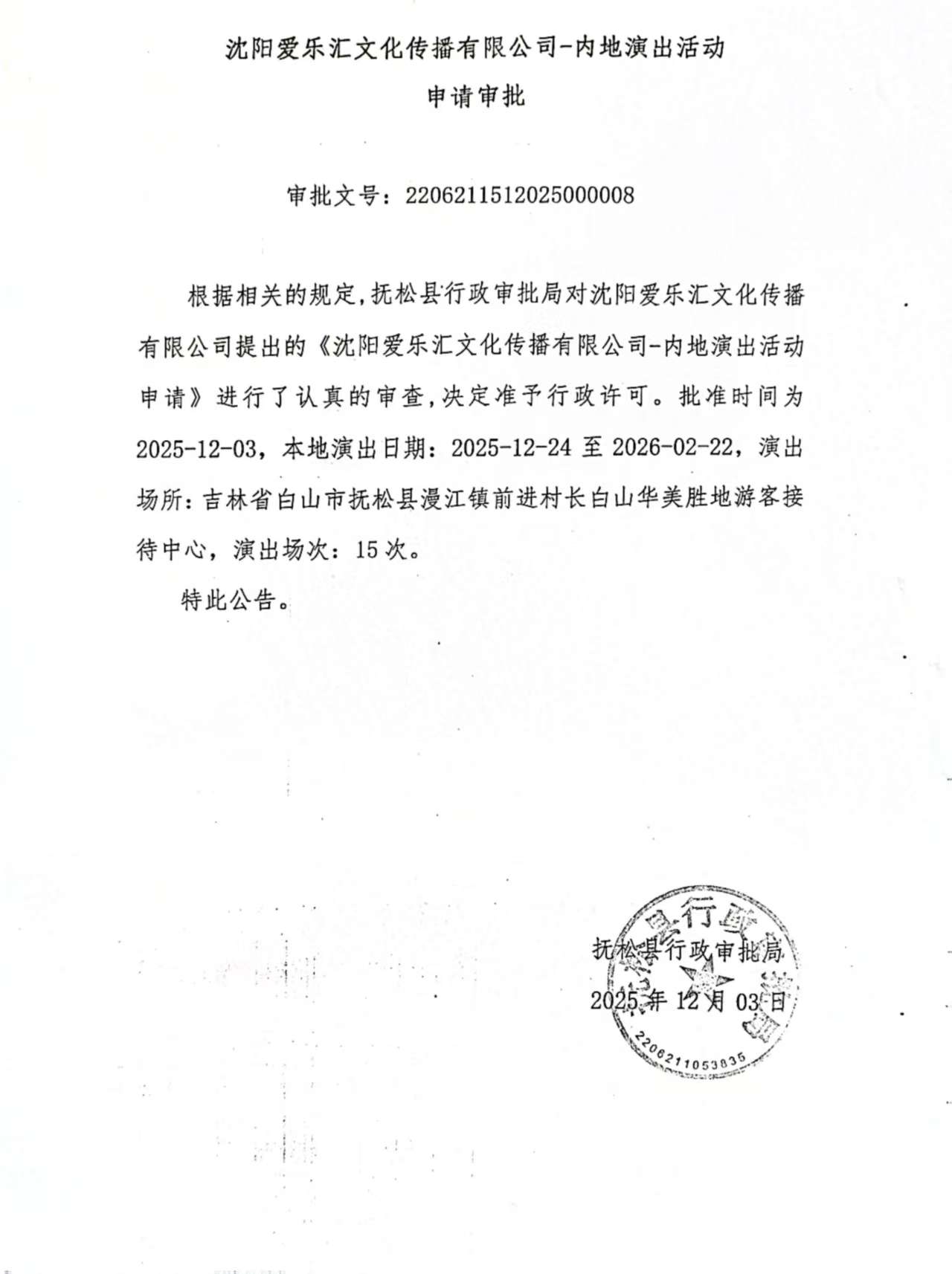 沈阳爱乐汇文化传播有限公司-内地演出活动申请审批