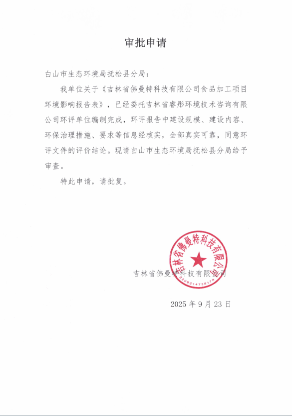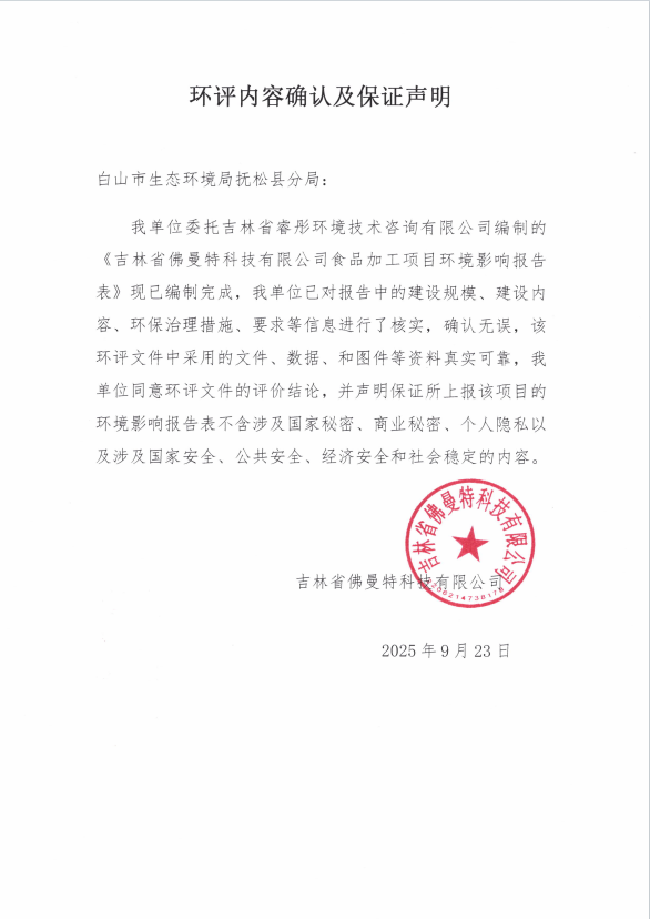 根据建设项目环境影响评价审批程序的有关规定,现将吉林省佛曼特科技有限公司食品加工项目环境影响报告表受理情况予以公示,公示期为3个工作日。自公示之日起,建设单位和利害关系人享有要求听证的权利。