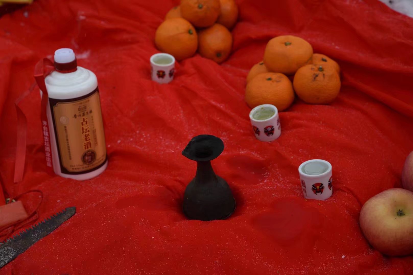 “开山仪式”的供品由采参工具、果品、酒、纸码、香、鞭炮组成。仪式开始,由崔长安把头向山神敬献供品并发出祈祷,参与开山的山民共同以屈膝叩头大礼向山神致敬,祈愿一年里进山顺利,平安发财。接下来是焚香、烧纸码、敬酒、鸣放鞭炮。一声炮响,意味着新年的庆祝活动已然结束,人们又将回归到正常的生活劳作,同时也是在向长白山发出宣告,这一年里人们将继续靠山吃山,也将延续北岗山民敬山、养山的传统精神。