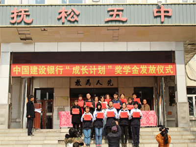 捐资助学是一项功在当代、利在千秋的事业,4月3日,中国建设银行“成长计划”奖学金发放仪式在抚松县第五中学举行。中国建设银行白山市分行副行长王欣、抚松县教育局副局长姚宗刚、露水河镇镇长李易平、露水河建设银行分行行长、吉林电视台《书香栏目组》领导、露水河电视台领导、抚松五中校领导以及部分嘉宾出席了本次活动,学校德育副校长韩应军主持此次发放仪式。