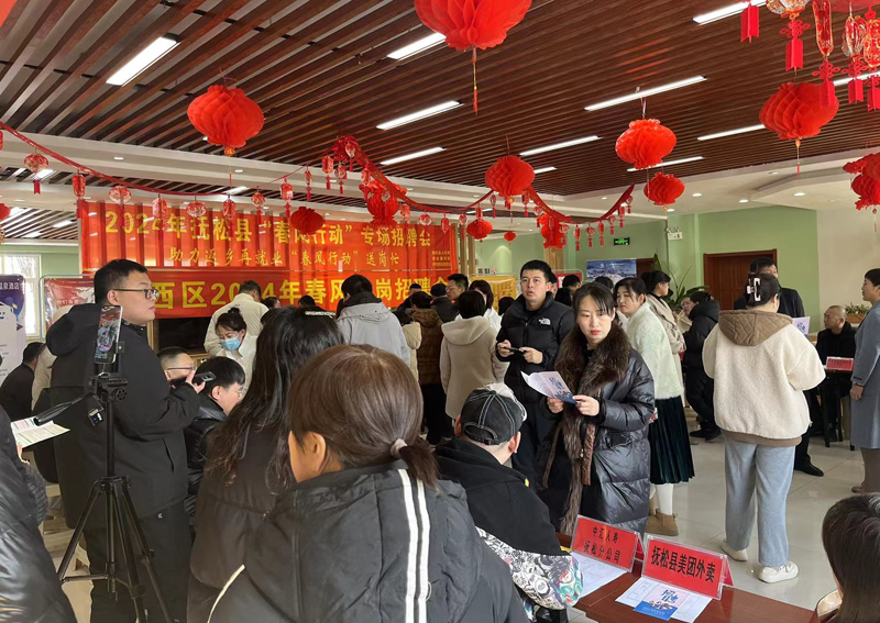 近日,抚松县人力资源和社会保障局、团县委、县妇联联合池西区人社局在松江河镇站前社区开展2024年首场“春风行动”专场招聘会,松江河中医院、农夫山泉、万达酒店群等31家用人单位、居民400余人参加。