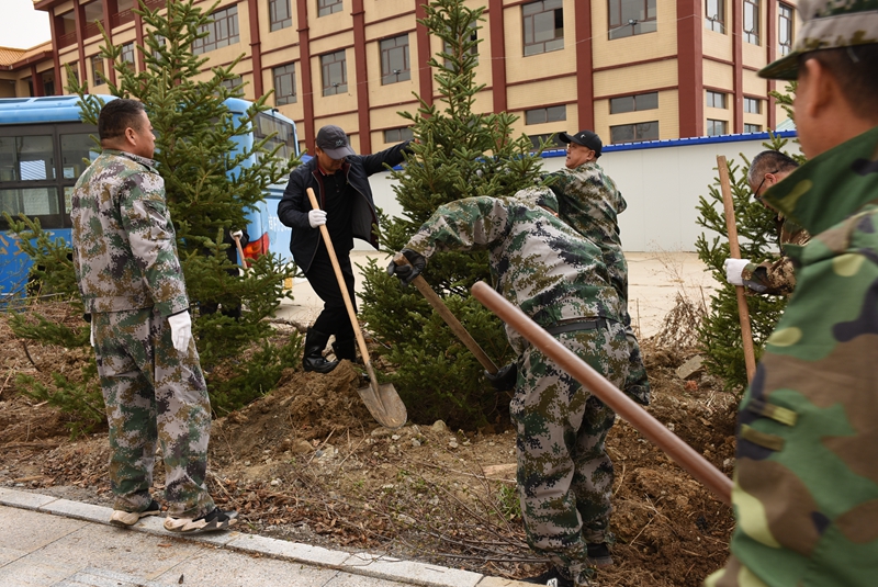 植树现场,县领导与广大干部群众一起挥锹铲土、扶正树苗、填坑夯苗、浇水养护。大家分工协作、互相配合,现场繁忙而有序,一派热火朝天的劳动景象。一株株新栽种的云杉树苗落地扎根,迎风挺立,孕育着勃勃生机,焕发出绿色希望。