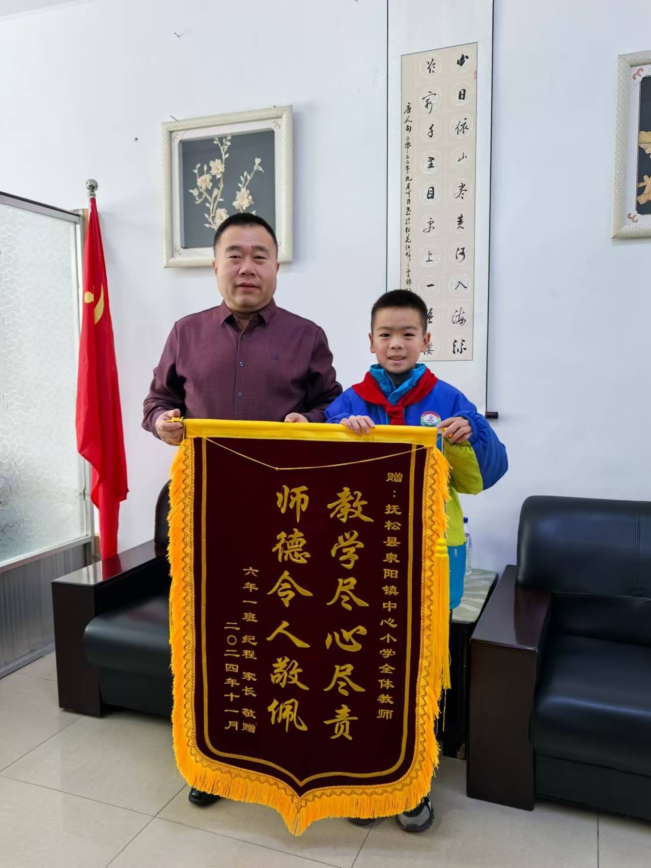 近日,抚松县泉阳镇中心小学收到了学生家长精心准备的锦旗,这份礼物不仅表达了对学校管理工作的高度认可,也传递了对老师们辛勤付出的深深感激。