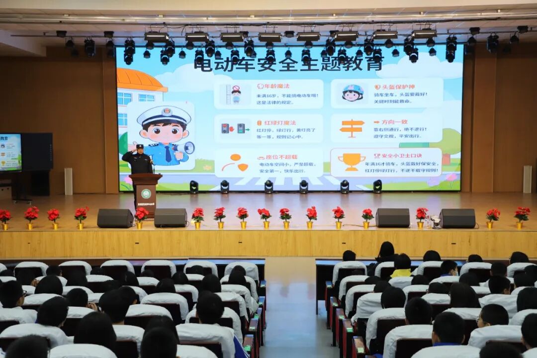 在电动车安全骑行宣讲环节,民警结合道路交通安全管理相关规定,明确强调未满16周岁禁止驾驶电动自行车上道路行驶的硬性要求,详细普及骑行靠右通行、不逆行、不闯红灯、不违规载人载物、规范佩戴安全头盔等安全骑行知识,通过以案释法的方式,剖析违规骑行带来的安全隐患与严重后果,引导学生时刻紧绷交通安全弦,自觉遵守交通法规,养成安全、文明的出行习惯,向全体师生发放文明骑行宣传单共计1800份,图文并茂的形式让交通安全知识更加深入人心。