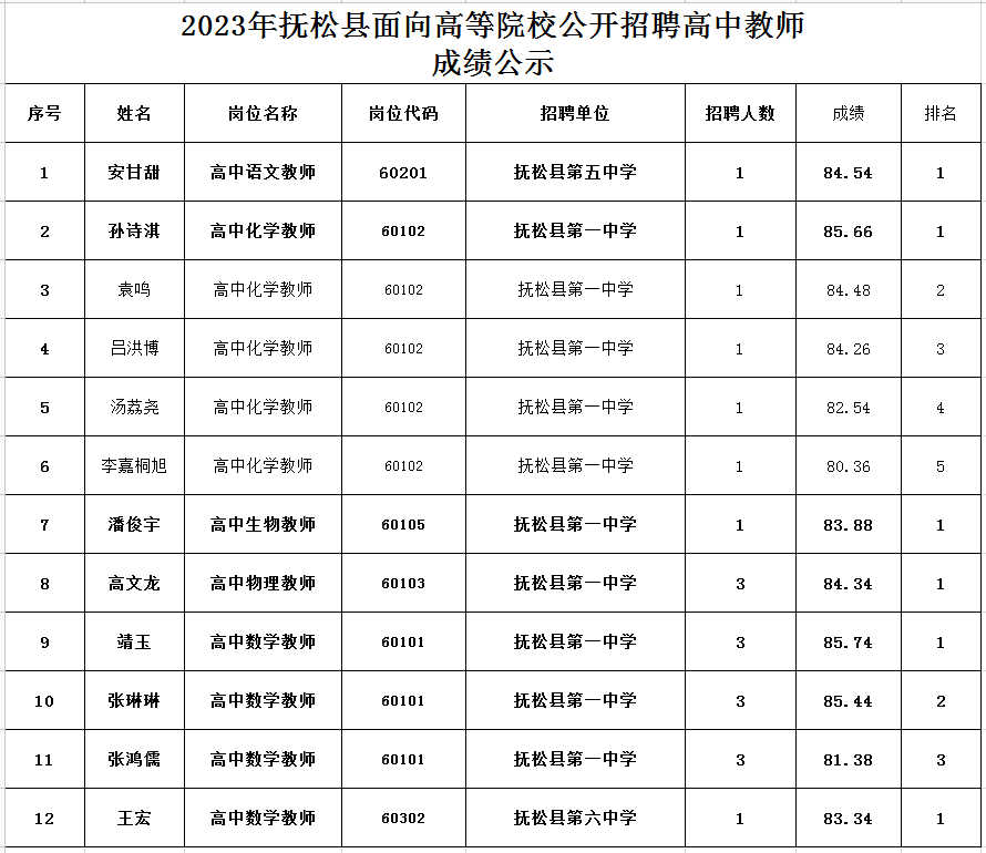 2023年抚松县面向高等院校公开招聘高中教师成绩面向社会公示,欢迎考生和社会各界广泛监督。