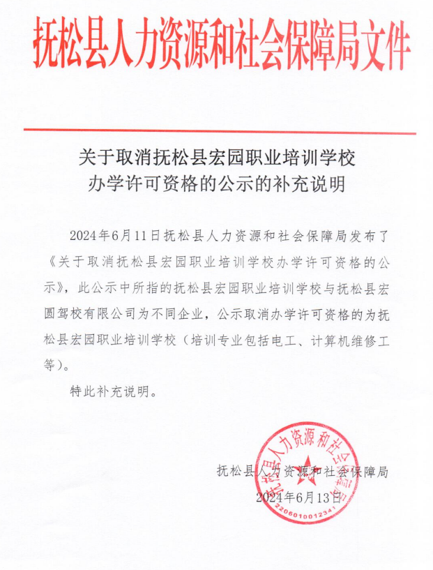 2024年6月11日抚松县人力资源和社会保障局发布了《关于取消抚松县宏园职业培训学校办学许可资格的公示》,此公示中所指的抚松县宏园职业培训学校与抚松县宏圆驾校有限公司为不同企业,公示取消办学许可资格的为抚松县宏园职业培训学校(培训专业包括电工、计算机维修工等)。