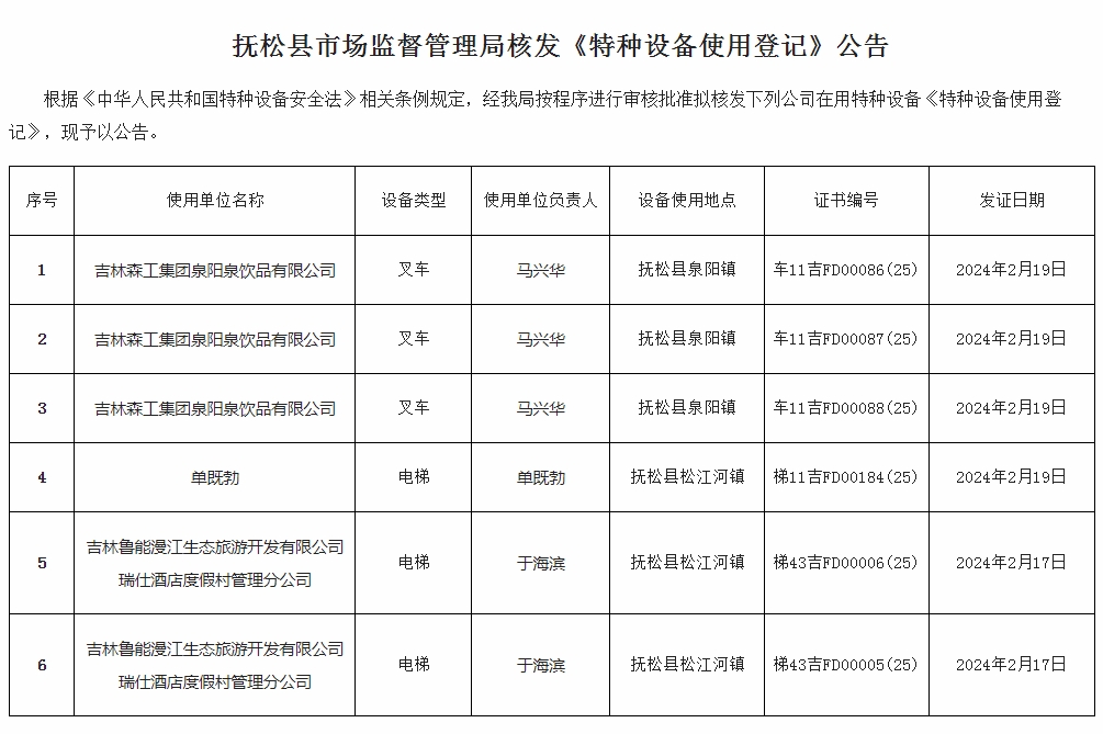 抚松县市场监督管理局核发 《特种设备使用登记》公告