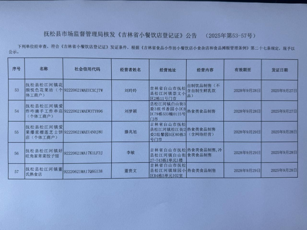 抚松县市场监督管理局核发《吉林省小餐饮店登记证》公告 (2025年第53-57号)