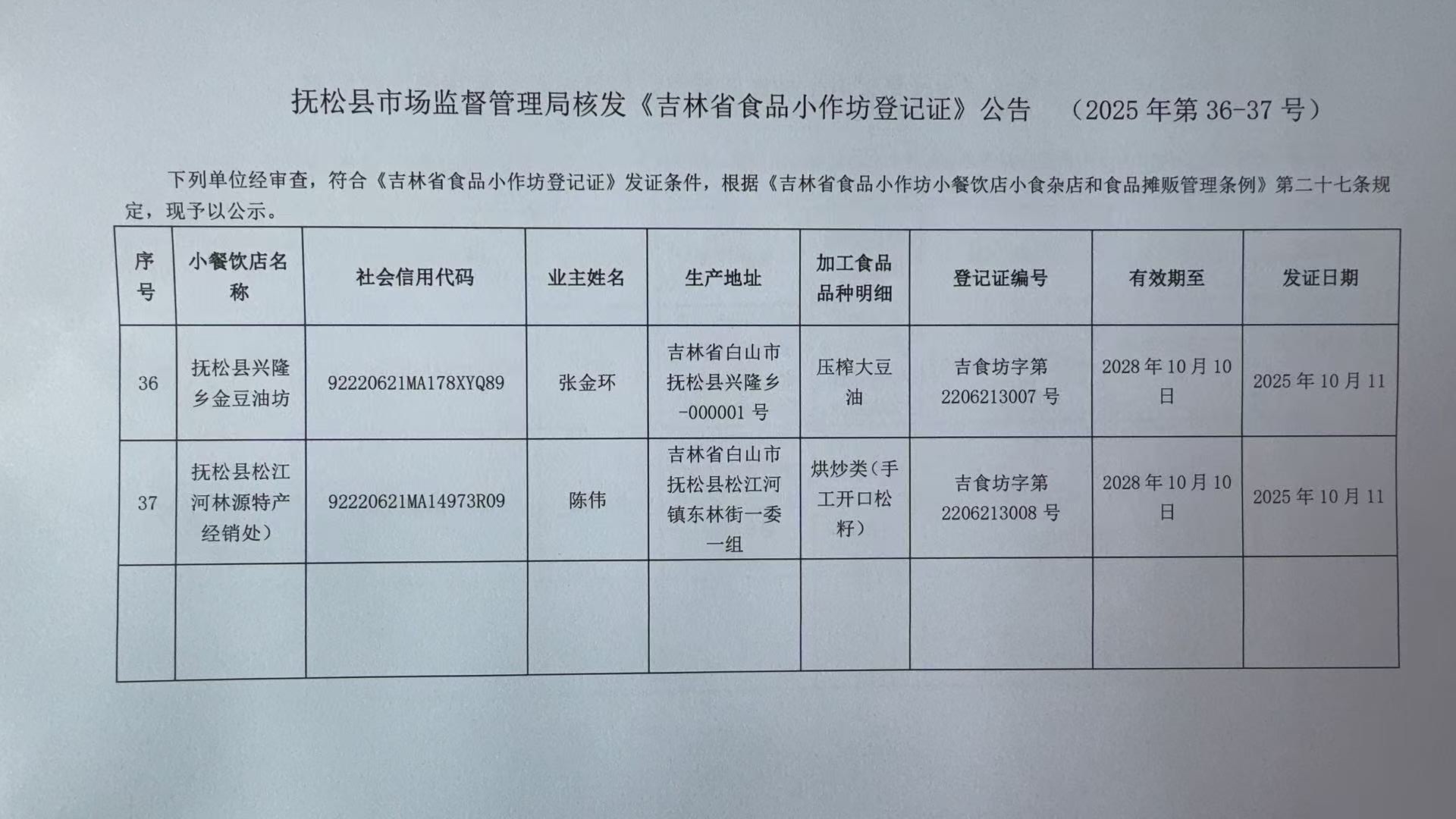 抚松县市场监督管理局核发 《吉林省食品小作坊登记证》公告(2025年第36-37号)