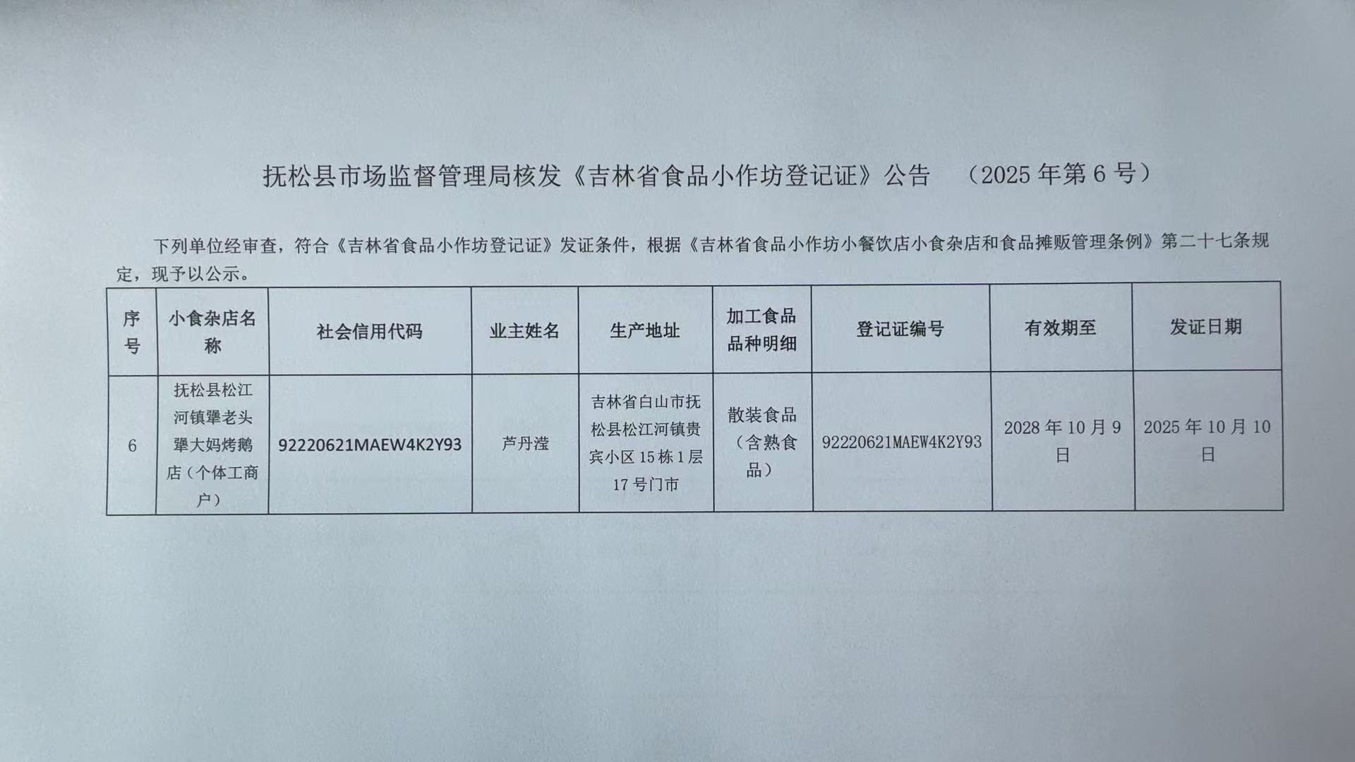 抚松县市场监督管理局核发 《吉林省食品小作坊登记证》公告(2025年第6号)