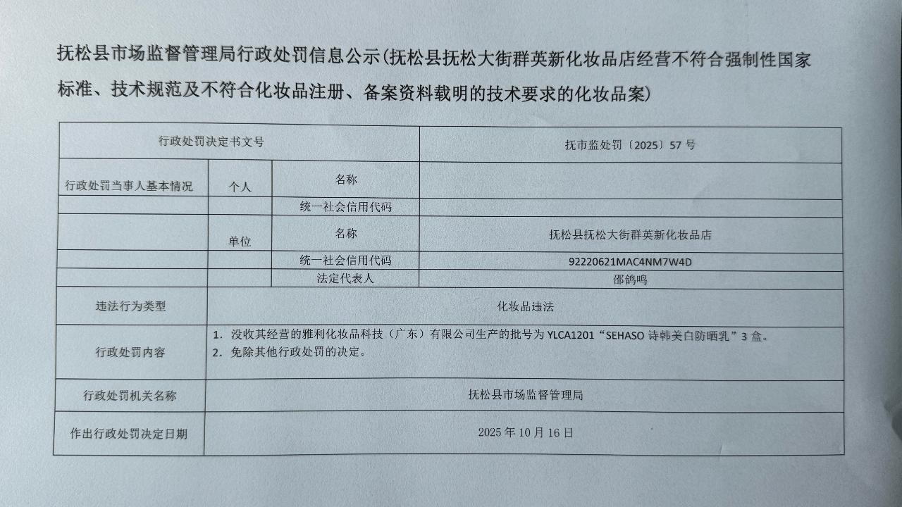 抚松县市场监督管理局行政处罚信息公示