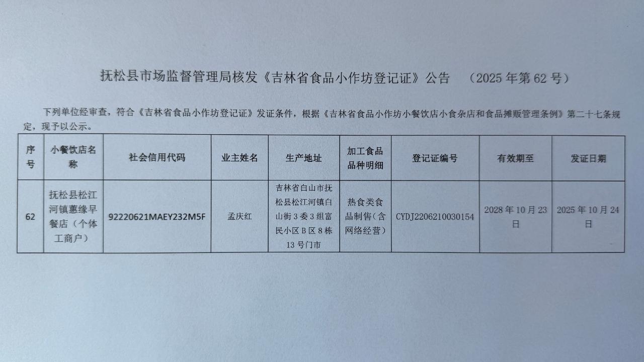 抚松县市场监督管理局核发 《吉林省食品小作坊登记证》公告