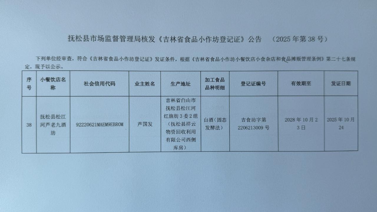 抚松县市场监督管理局核发 《吉林省食品小作坊登记证》公告