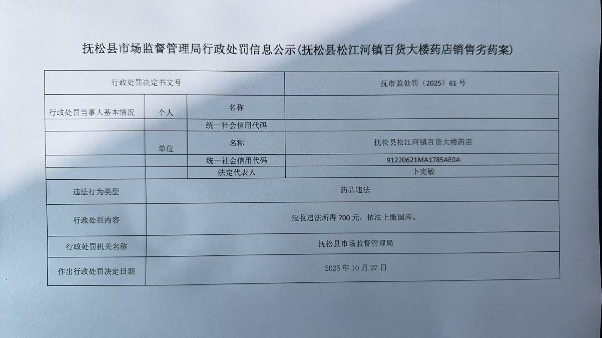 抚松县市场监督管理局行政处罚信息公示(抚松县松江河镇百货大楼药店销售劣药案)