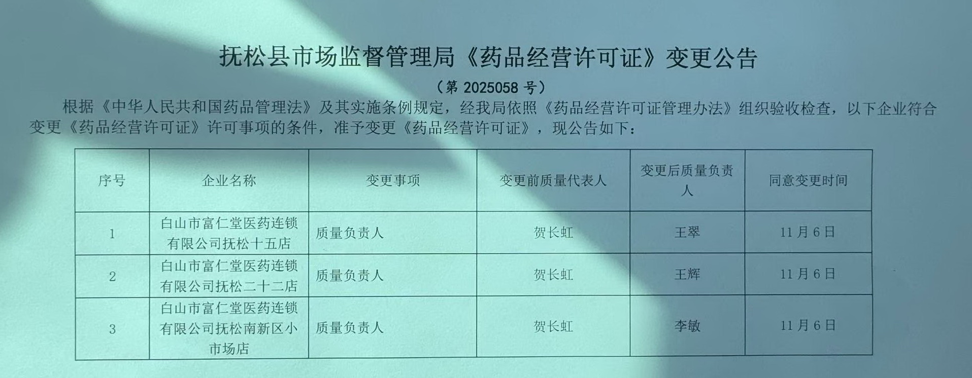 抚松县市场监督管理局《药品经营许可证》变更公告