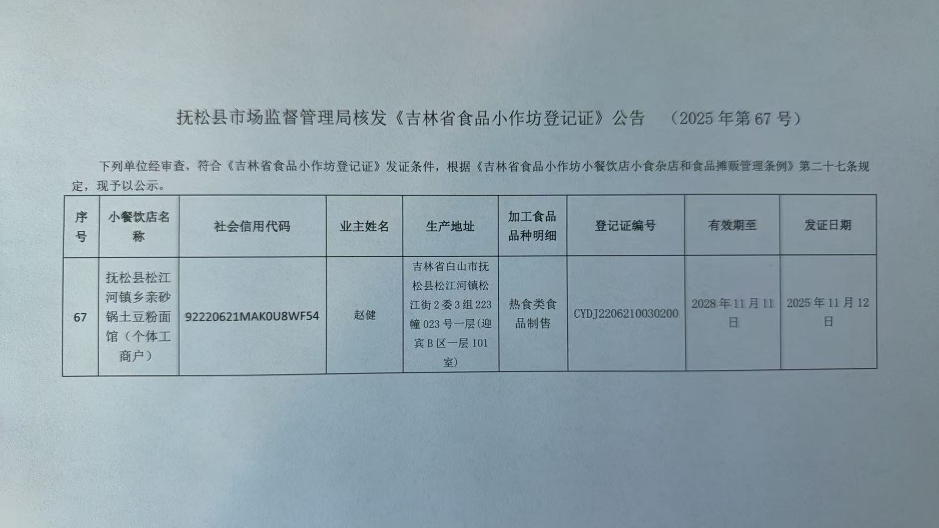 抚松县市场监督管理局核发 《吉林省食品小作坊登记证》公告