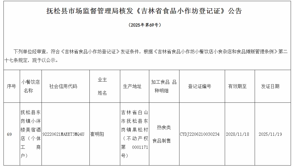 抚松县市场监督管理局核发 《吉林省食品小作坊登记证》公告