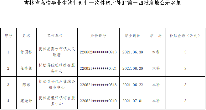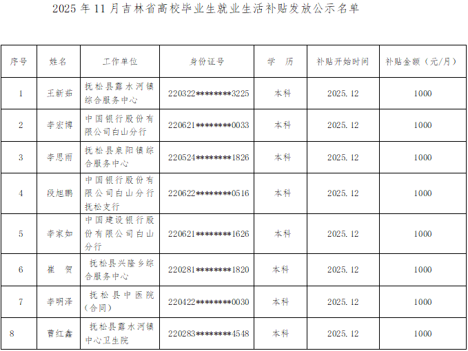 根据省委、省政府《关于促进高校毕业生就业创业若干措施》(吉发(2024)7号)及《吉林省高校毕业生就业生补贴实施细则(暂行)》等6项实施细则的文件精神,现将2025年吉林省高校毕业生就业生活补贴、就业创业一次性购房补贴发放人员名单公示如下: