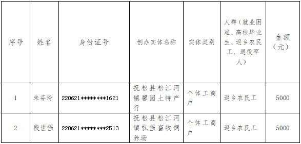 根据吉林省人力资源和社会保障厅、吉林省财政厅《关于做好初次创业补贴申请发放工作的通知》(吉人社联(2020)20号)文件精神,现将抚松县2025年初次创业补贴发放人员名单公示如下: