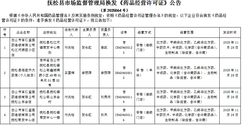 抚松县市场监督管理局换发《药品经营许可证》公告