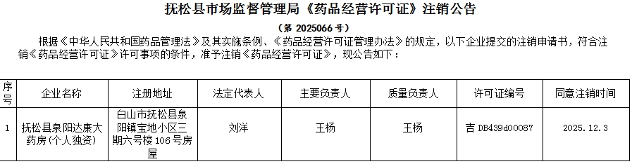 抚松县市场监督管理局《药品经营许可证》注销公告