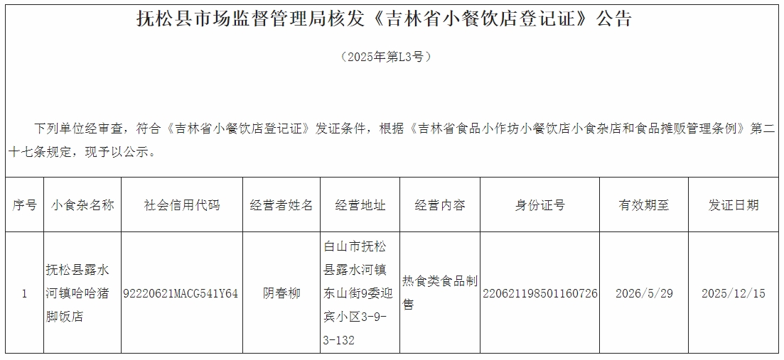抚松县市场监督管理局核发 《吉林省食品小餐饮登记证》公告