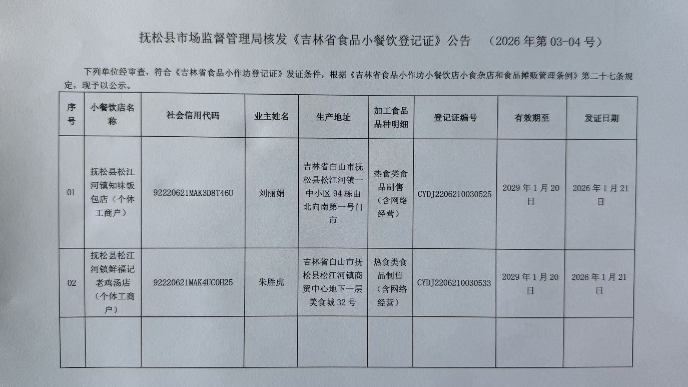 抚松县市场监督管理局核发《吉林省食品小餐饮登记证》公告 (2026年第03-04号)