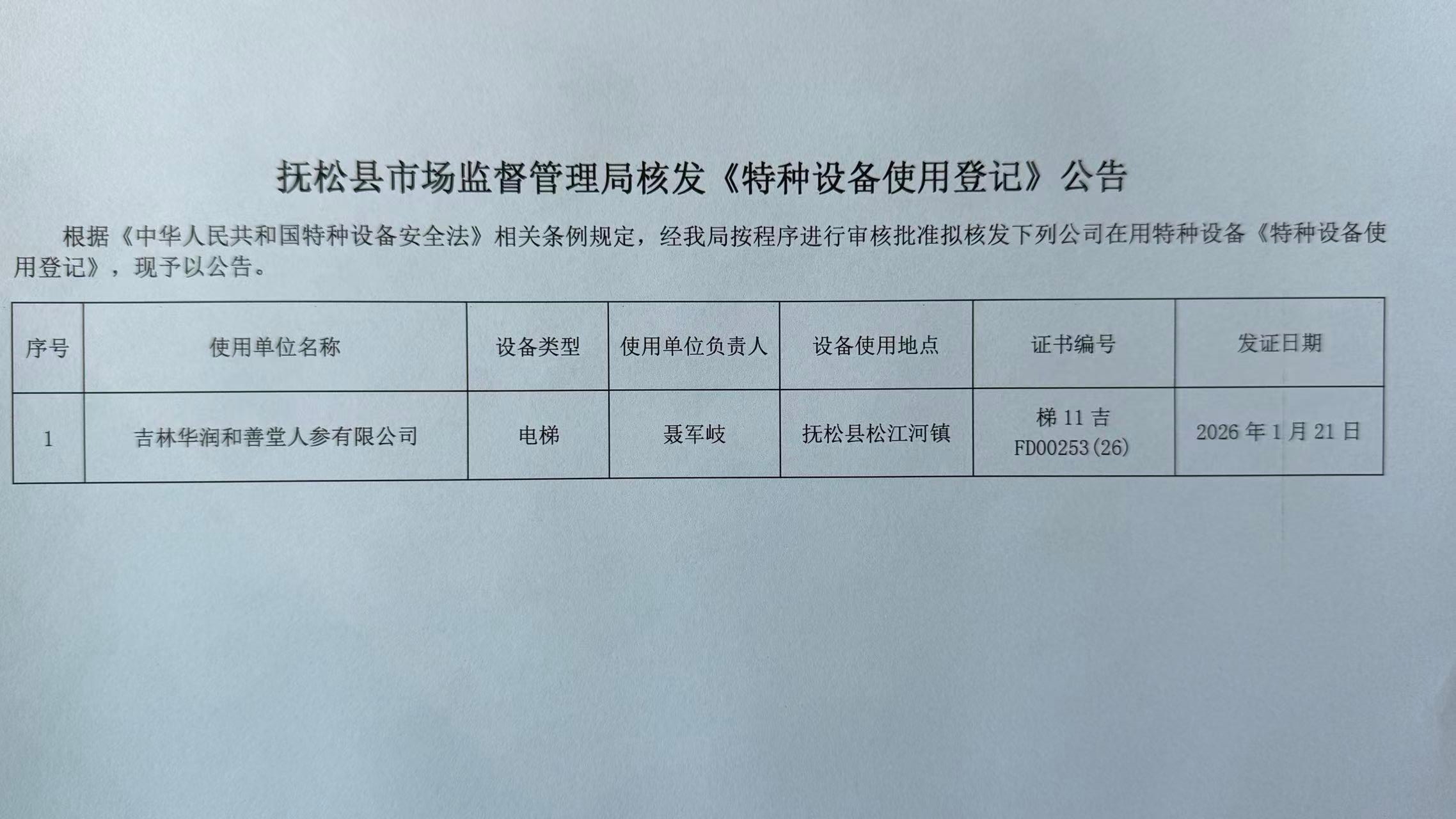抚松县市场监督管理局核发 《特种设备使用登记》公告