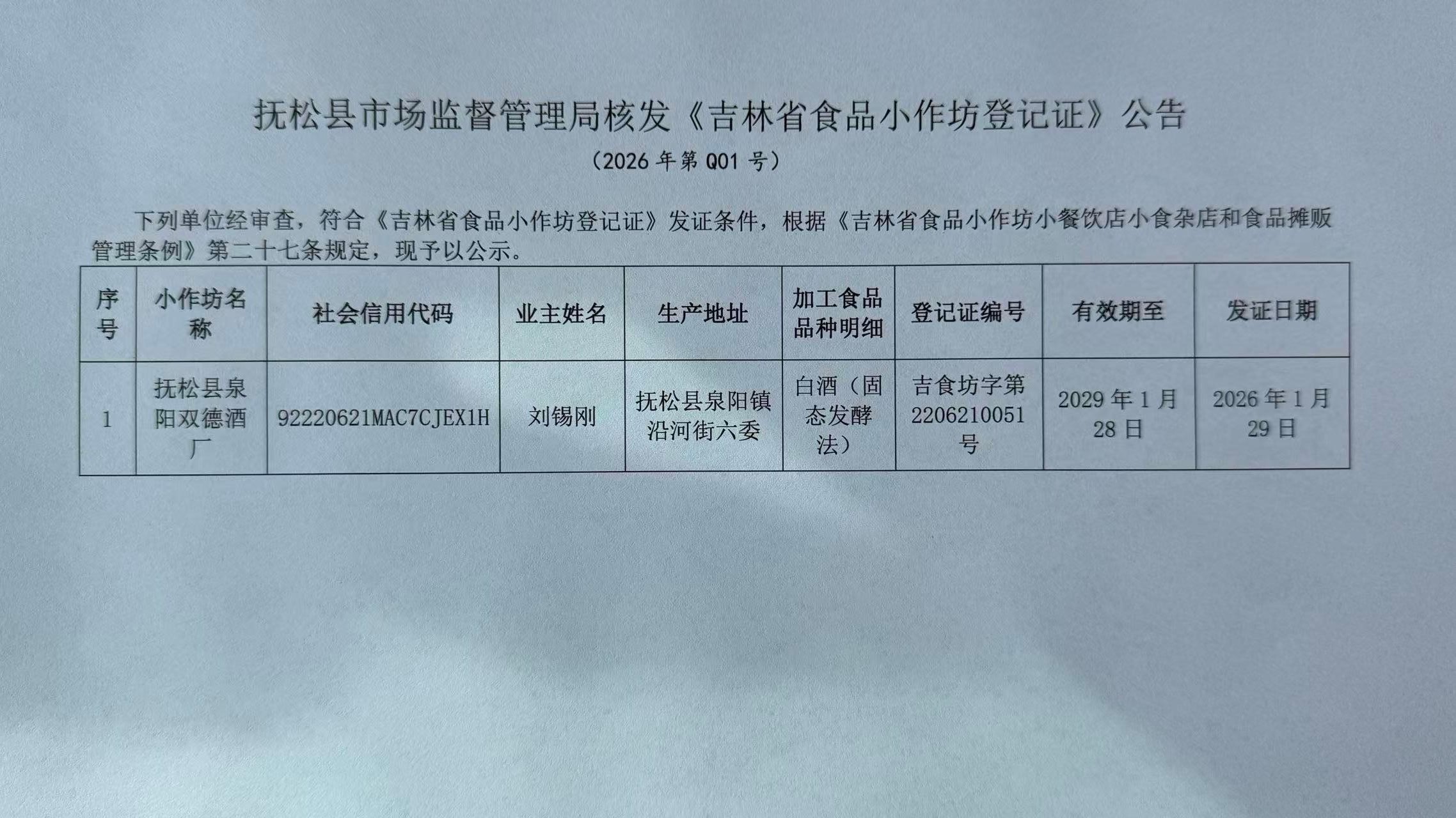 抚松县市场监督管理局核发《吉林省食品小作坊登记证》公告(2026年第Q01号)