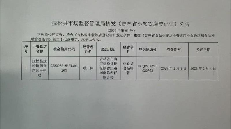 抚松县市场监督管理局核发《吉林省小餐饮店登记证》公告 (2026年第02号)