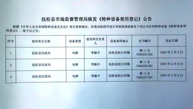 抚松县市场监督管理局核发《特种设备使用登记》公告