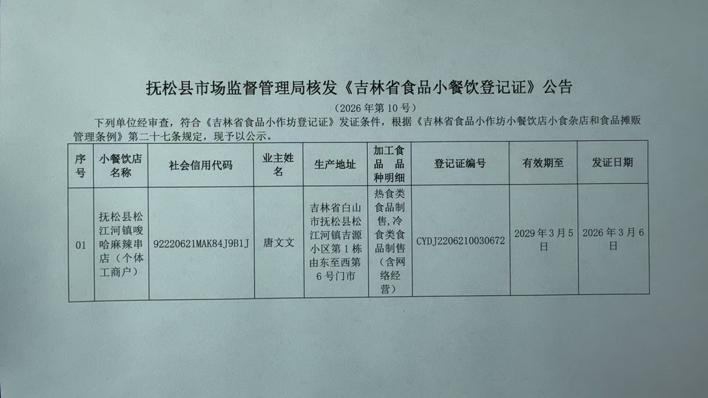 抚松县市场监督管理局核发《吉林省食品小餐饮登记证》公告 (2026年第10号)