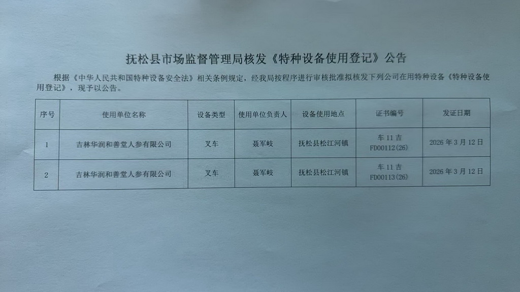抚松县市场监督管理局核发《特种设备使用登记》公告