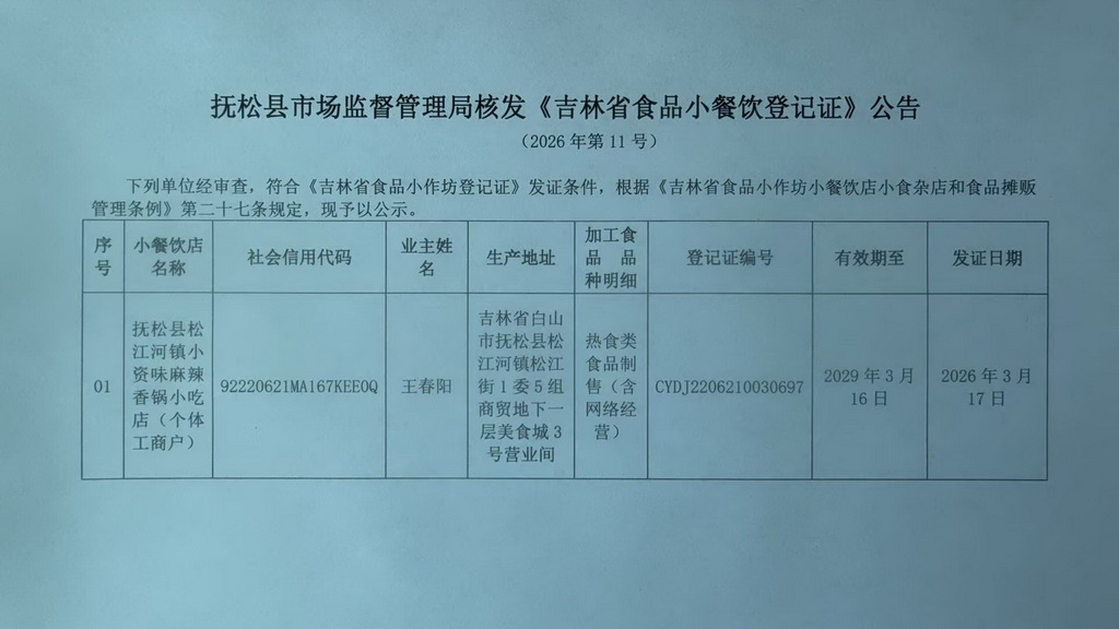 抚松县市场监督管理局核发《吉林省食品小餐饮登记证》公告 (2026年第11号)