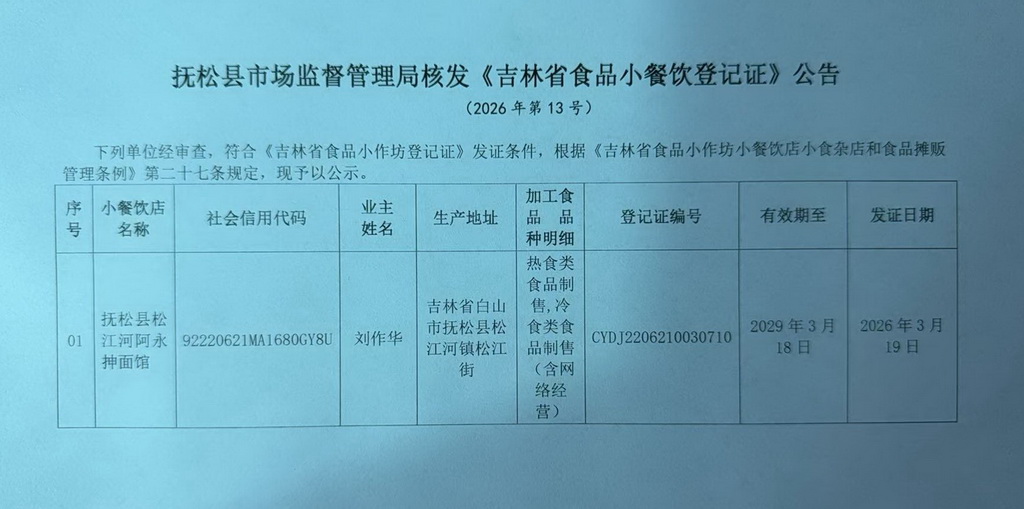 抚松县市场监督管理局核发《吉林省食品小餐饮登记证》公告 (2026年第13号)