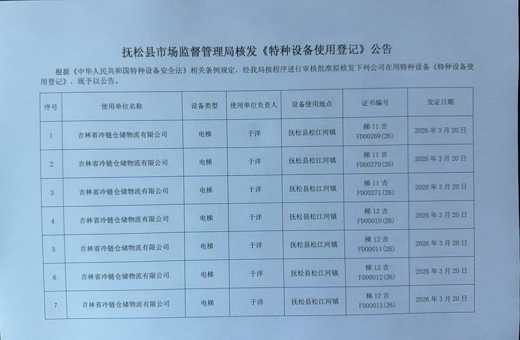 抚松县市场监督管理局核发《特种设备使用登记》公告