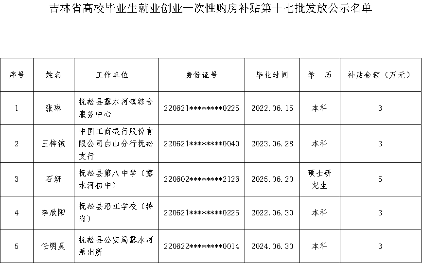 根据省委、省政府《关于促进高校毕业生就业创业若干措施》(吉发〔2024〕7 号)及《吉林省高校毕业生就业创业补贴实施细则(暂行)》等 6 项配套实施细则文件精神,现将吉林省高校毕业生就业创业一次性购房补贴发放人员名单公示如下: