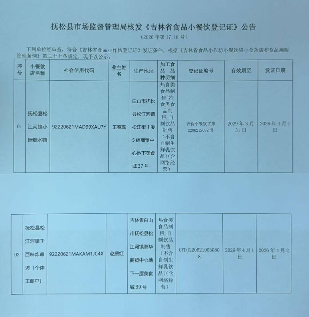 抚松县市场监督管理局核发《吉林省食品小餐饮登记证》公告(2026年第17-18号)