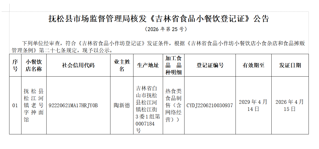 抚松县市场监督管理局核发《吉林省食品小餐饮登记证》公告(2026年第25号)