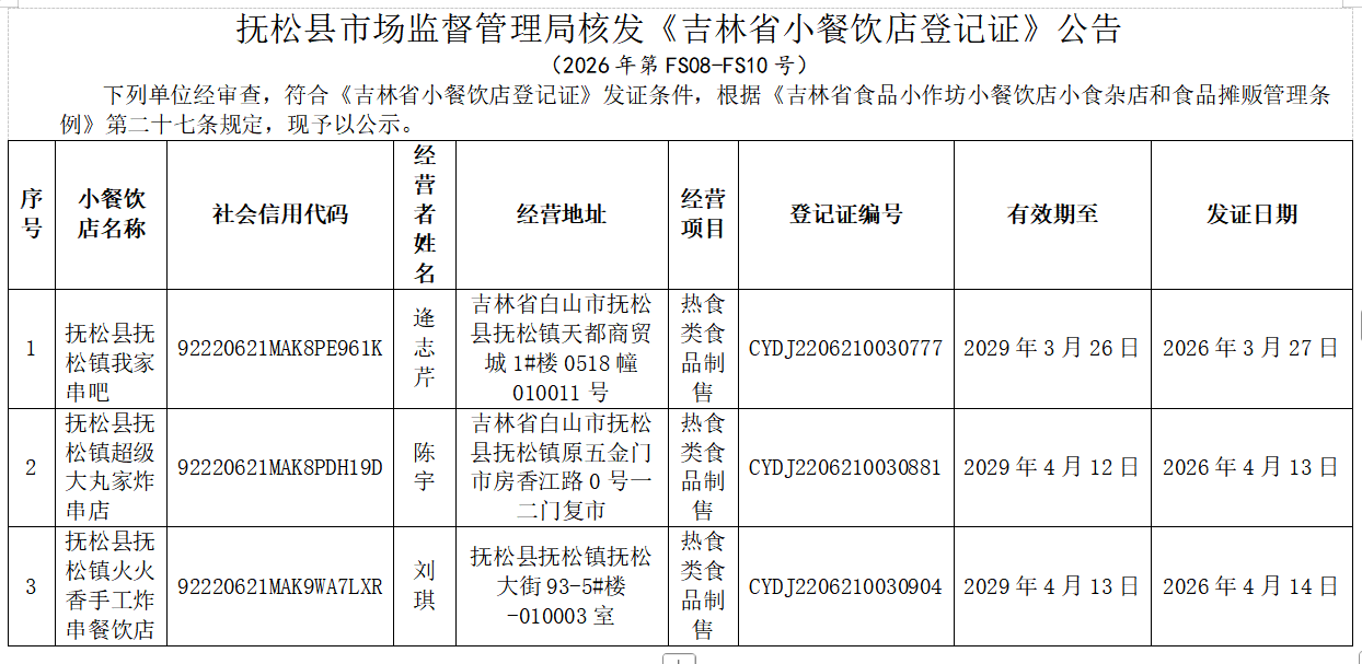 抚松县市场监督管理局核发《吉林省小餐饮店登记证》公告 (2026年第FS08-FS10号)