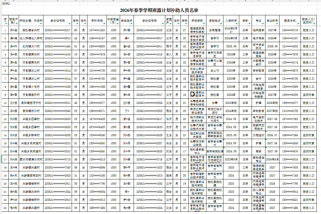根据《国务院扶贫办 教育部 人力资源和社会保障部关于加强雨露计划支持农村贫困家庭新成长劳动力接受职业教育的意见》(国开办发[2015]19号)文件的相关工作要求,经按程序审核,我县2026年春季学期符合雨露计划条件的学生共计27名,现将拟补助名单予以公示。