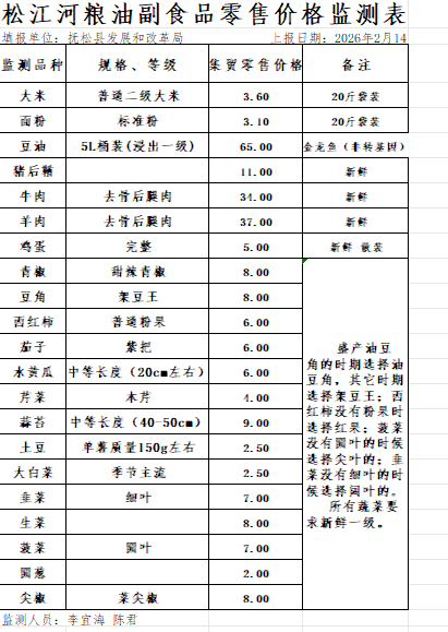 松江河粮油副食品零售价格监测表